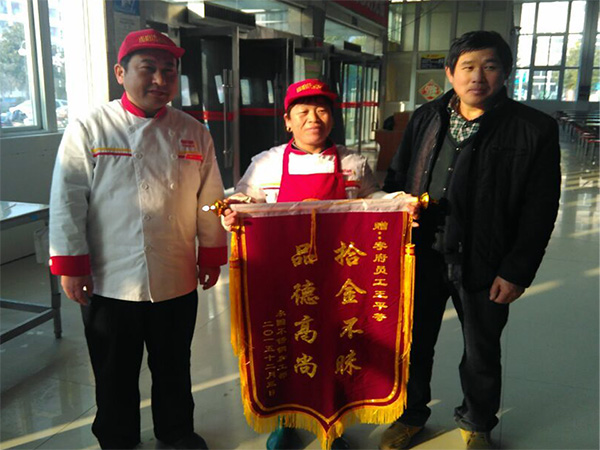 2015年12月2日晚 037vip开元,宿州学院食堂员工王平等,捡到钱包一个,内有现金5000多元,没有一丝犹豫,急失主之所急,经过多方询问,终于找到失主归还钱包,避免了失主物质上的损失和精神上的麻烦,失主白兴利非常感激,在第二天早晨就送上“品德高尚,拾金不昧”的锦旗。