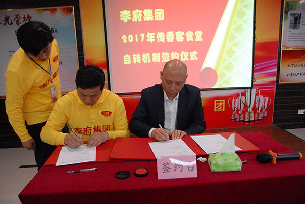 PPT分享结束后,传香客安职院,滁州学院,安理工食堂负责人带领各自团队逐一上台与辛董签订食堂经营机制并接受辛董的聘任书,集团副总经理 037vip开元官网,落地委领袖张超做为第三方见证此环节,食堂自转承包机制的签订充分体现我集团贯彻落实“我的地盘我做主,我的责任我承担,我的生命我体验”这一原则,将“百年李府梦”与每一位员工结合在一起,真正做到企业富,员工富。