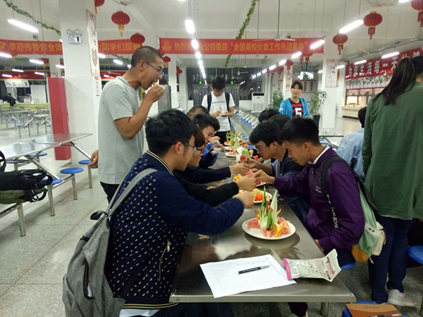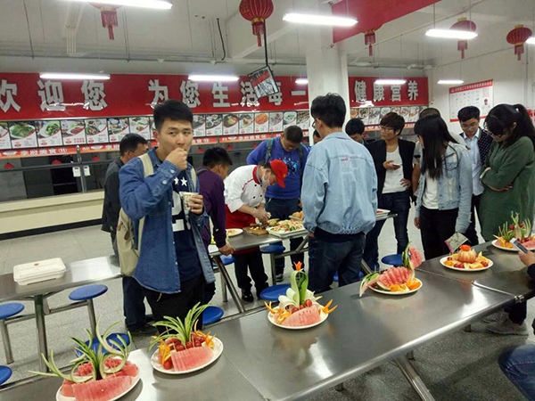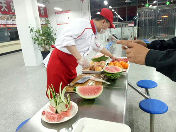 活动正式开始,集团技术部总监兼传香客安理工食堂经理王士朝开始了水果拼盘的现场教学,西瓜,圣女果,橙子,苹果等各种水果在他的创意和精细的刀工下 037vip开元app下载,被改造成片,丁,丝,块等形状,拼放成各种图案,拼盘色彩艳丽,精美绝伦,赢得了同学们的赞赏与惊叹,紧接着,王总监指导大家发挥自己独特的想象力,根据每个人所选的水果进行构思,雕刻和拼接,现场气氛热烈,拍照上传朋友圏的有之,现场视频直播的有之,同学们边学边玩,兴高采烈。