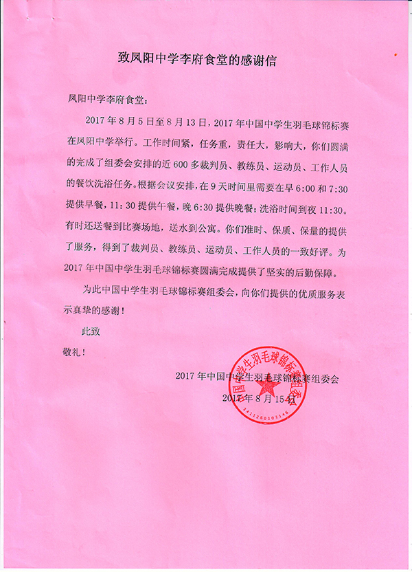 2017年8月5日至13日,“2017年中国中学生羽毛球锦标赛”在凤阳中学隆重举行,根据凤阳中学校领导及比赛组委会的工作指示 037vip开元,我集团下辖传香客凤阳中学食堂在比赛期间提供后勤保障工作, 。