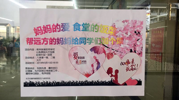 “爱子心无尽,归家喜及辰 037vip开元,寒衣针线密,家信墨痕新,”2018年的母亲节如约而至,我集团下辖各传香客食堂紧紧围绕“弘扬母亲节,李府伴你行”为主题开展各类回馈活动,倡导在校莘莘学子及时行孝,回报母爱,共建校企文化。