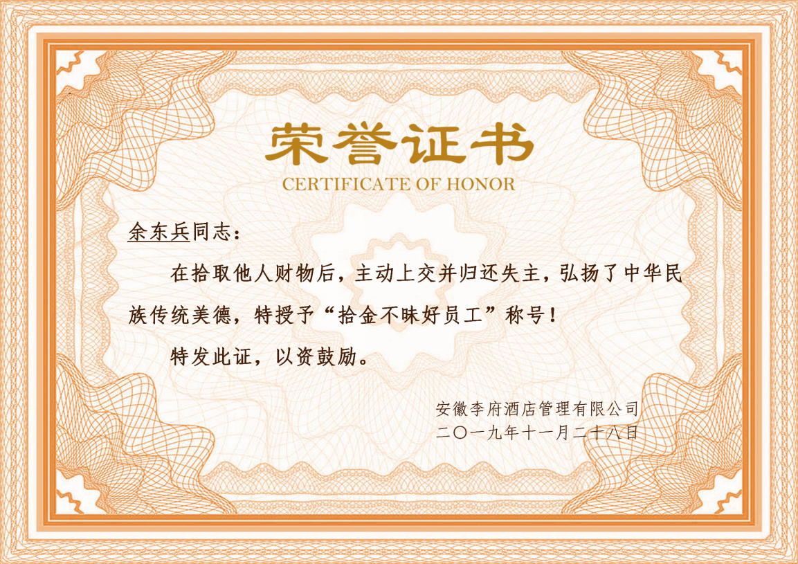 董事长得悉此事后,为集团屡次涌现的拾金不昧的好人好事倍感欣慰,按照集团相关制度,决定授予余东兵同志“拾金不昧好员工”荣誉称号,全公司通报表扬并奖励现金100元,同时号召全体员工向余东兵同志学习,共同营造037vip开元注册入口诚实守信,全心全意为客户服务的企业形象 037vip开元官网。