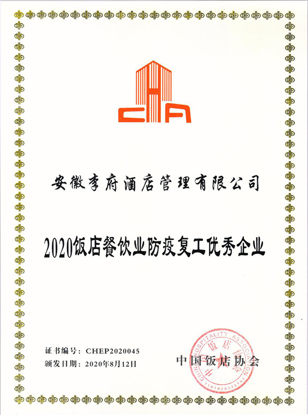 2020年8月12日,由国家商务部 037vip开元,全国绿色饭店工作委员会和中国饭店协会联合举办的2020年全国饭店餐饮业振兴大会(安徽)峰会在合肥天鹅湖大酒店隆重举行,大会发布了2020饭店餐饮业防疫复工优秀企业名单,我集团凭借在疫情防控和复工复业工作中的良好表现荣获中国饭店协会“2020饭店餐饮业防疫复工优秀企业”荣誉称号。