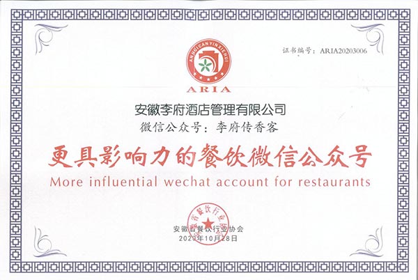 “李府传香客”公众号自2015年创建以来,一直作为企业品牌宣传的重要载体,秉承“感动客户”的服务理念,在形式,内容,版面上紧跟时代步伐,保持每周推新的频率 037vip开元官网,不断向读者奉献高质量的内容,此次获得“更具影响力餐饮微信公众号”的荣誉称号,是行业和广大读者对李府不懈追求的最大认可和肯定,037vip开元注册入口将再接再厉,倍加珍惜获得的成就和荣誉,不断提高餐饮管理能力和服务水平,进一步推进李府餐饮品牌化和数字化进程,为做大做强我省餐饮行业再做贡献。