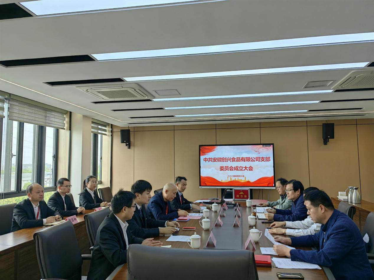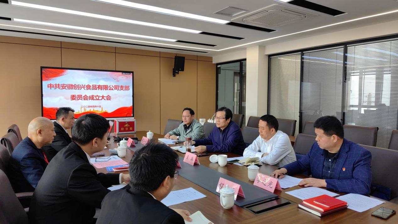 2024年4月10日10点 037vip开元,中国共产党安徽创兴食品有限公司支部委员会成立会议隆重召开,集团董事长辛国芳同志,安徽巢湖经济开发区企业党委副书记郑武斌同志,党建指导员徐立法同志,李之光同志出席了此次会议。