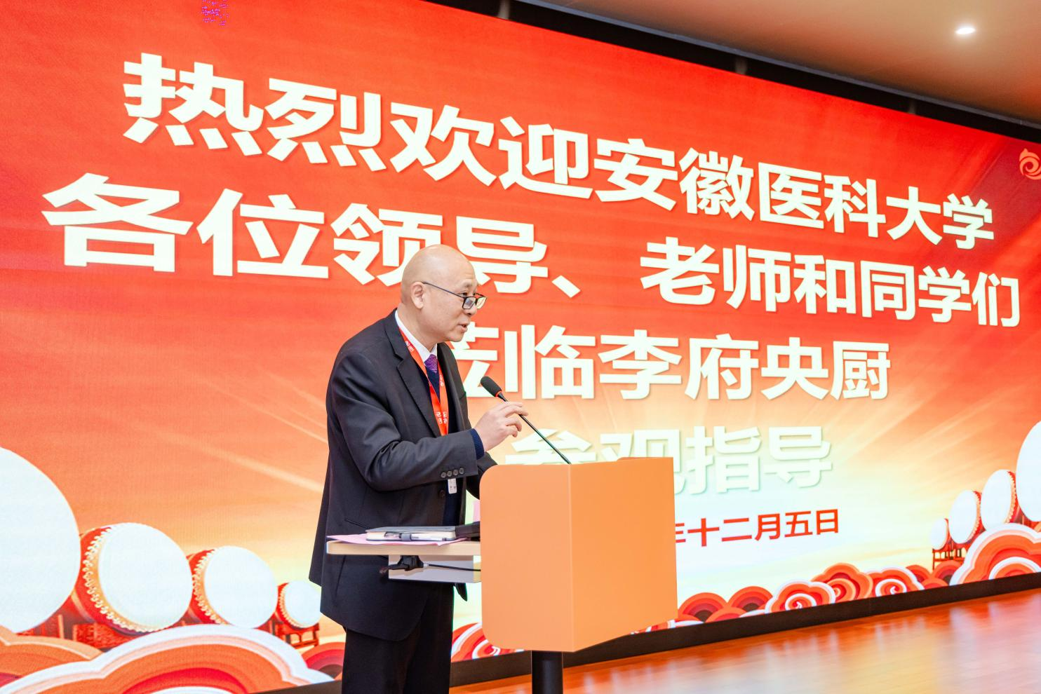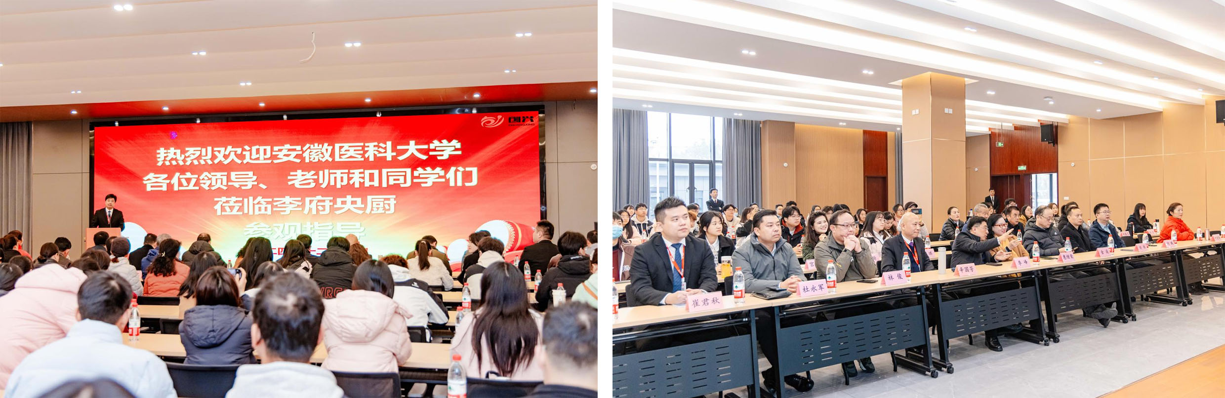 首先,在多功能报告厅内,集团董事长辛国芳先生先向安徽医科大学的各位领导与师生致以最诚挚的欢迎词,接着详细介绍了集团的发展历程,主营业务和发展方向,并邀请师生们观看了“李府央厨”宣传片 037vip开元app下载,随后,在工作人员的引领下,一行人实地参观了央厨的标准化生产车间,检验室,仓储物流平台及研发中心,师生们亲眼见证了面点,烤鸭,净菜,卤肉等各类食品从原材料源头采购验收,到净菜加工,面点制品,烤鸭制作,熟食卤制品等食品自动化加工,物流冷链配送的全链条智能化运作过程,其高效,精准且严格的作业模式给师生们留下了深刻的印象,通过近距离全方位地观察校园食品的完整生产加工流程,亲身体验新质生产力在现代食品加工领域所发挥的引领性作用与效能。