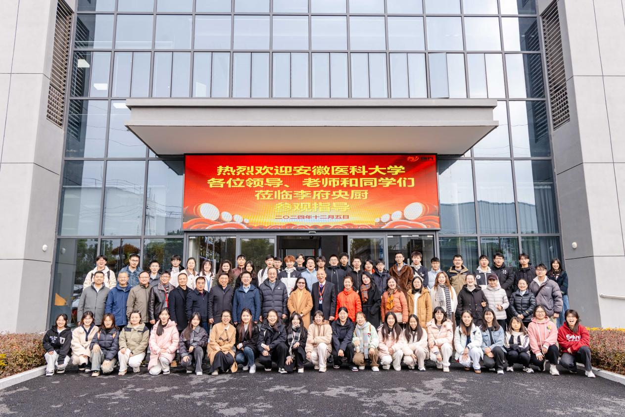 2024年12月5日上午,安徽医科大学工会主席惠继荣,校医院院长金涌 037vip开元,卫管学院副书记胡鹏,后勤处副处长(后勤集团负责人)李峰,东校区管委会副主任刘伟等领导,老师和学生代表一行70余人,莅临我司旗下“李府央厨”—创兴食品工厂参观交流,集团董事长辛国芳,副总经理张超,崔君秋及央厨生产管理部总监唐钢热情接待并陪同参观。